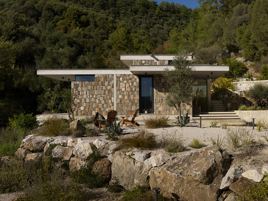 Ngôi nhà Elmali, tọa lạc tại làng Elmali yên bình ở Ula, Muğla, nằm ngay điểm giao thoa của dòng suối tự nhiên và khu rừng rậm, được bao quanh bởi những hàng thông xanh và tầm nhìn ra sườn dốc phía đông nam của làng. Dự án là sự kết hợp độc đáo giữa hai cấu trúc riêng biệt: một ngôi nhà chính hiện đại một tầng bằng bê tông với hai phòng ngủ, bếp mở, sân hiên và hồ bơi, cùng với một nhà khách được tái thiết dựa trên kiến trúc truyền thống đặc trưng của làng Ula. Sự kết hợp này không chỉ tạo nên một không gian sống đa dạng mà còn là cầu nối tinh tế giữa phong cách kiến trúc đương đại và di sản văn hóa địa phương.